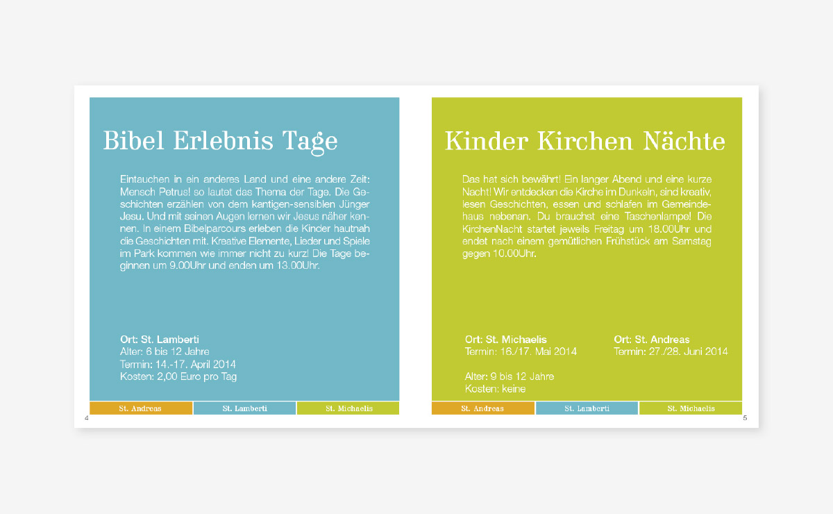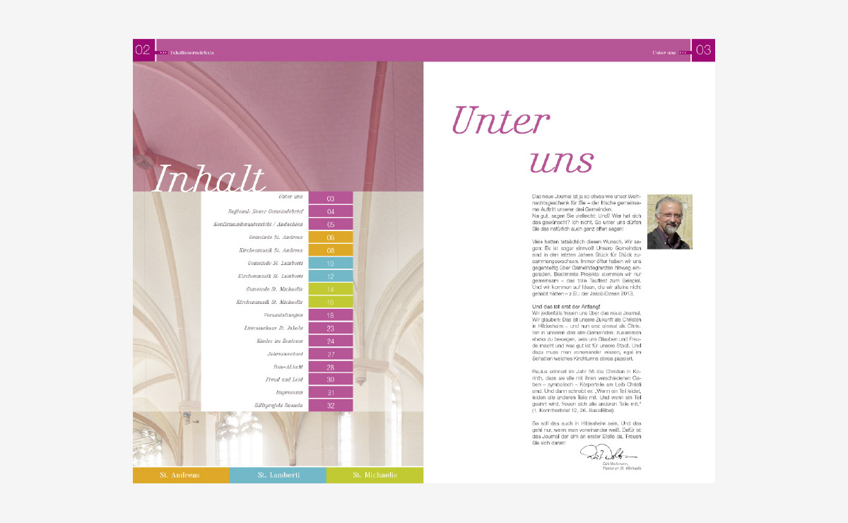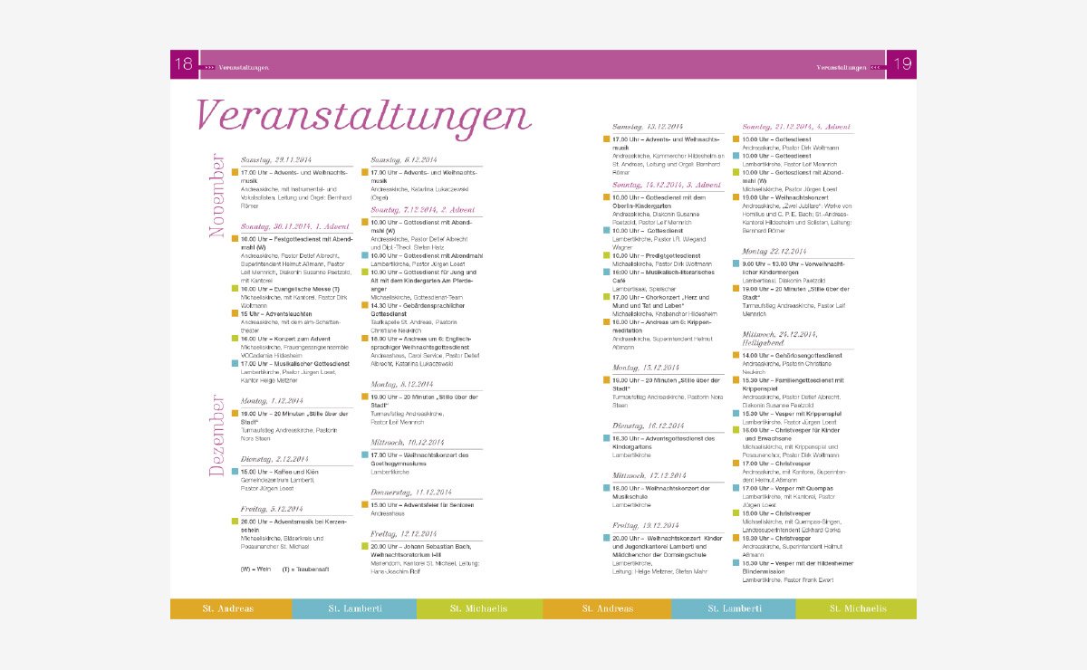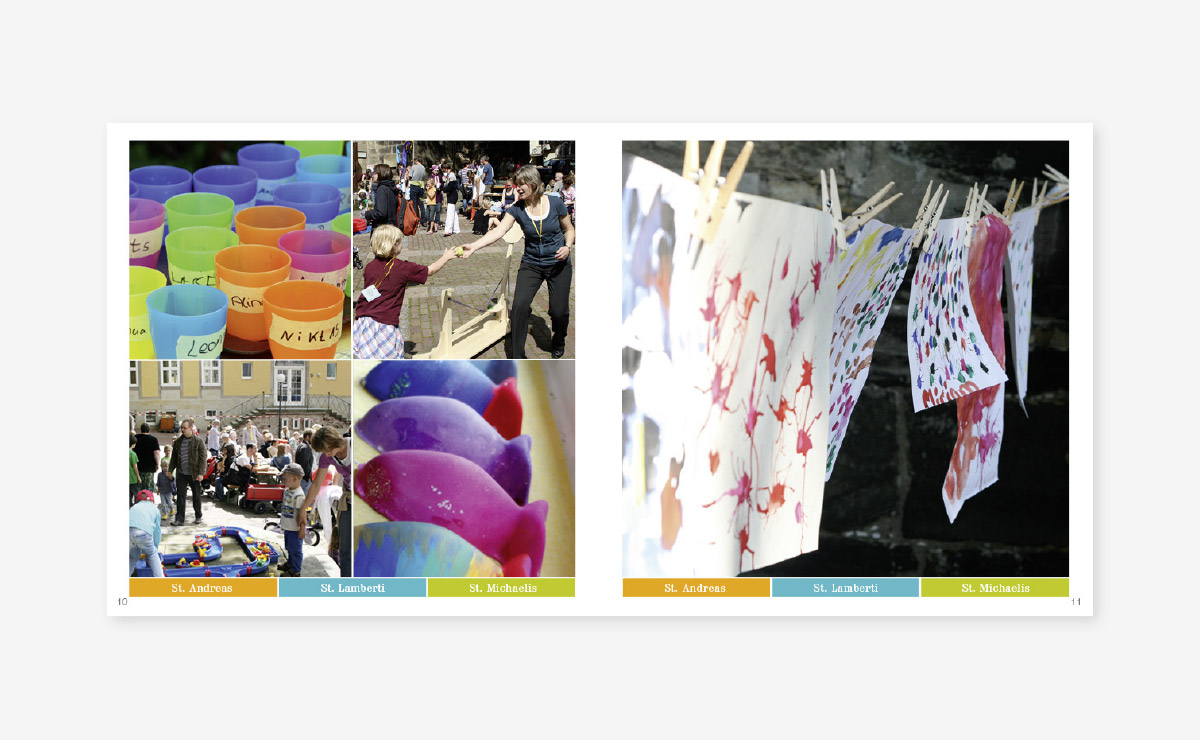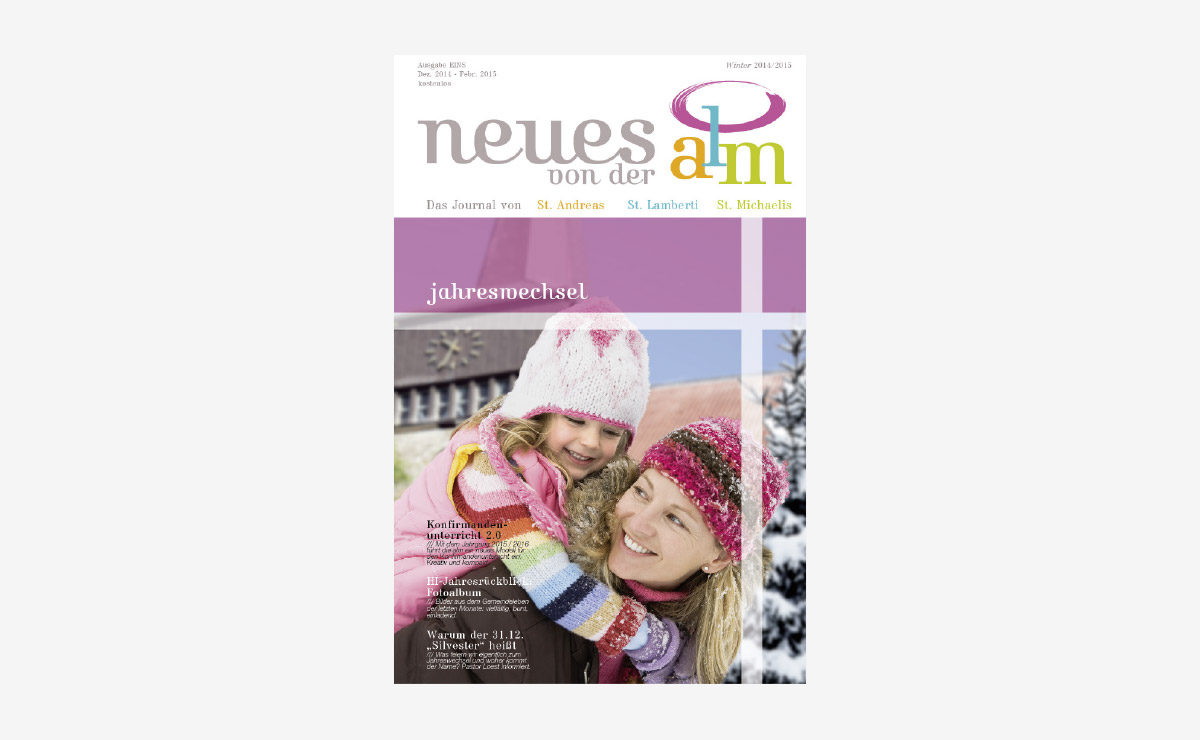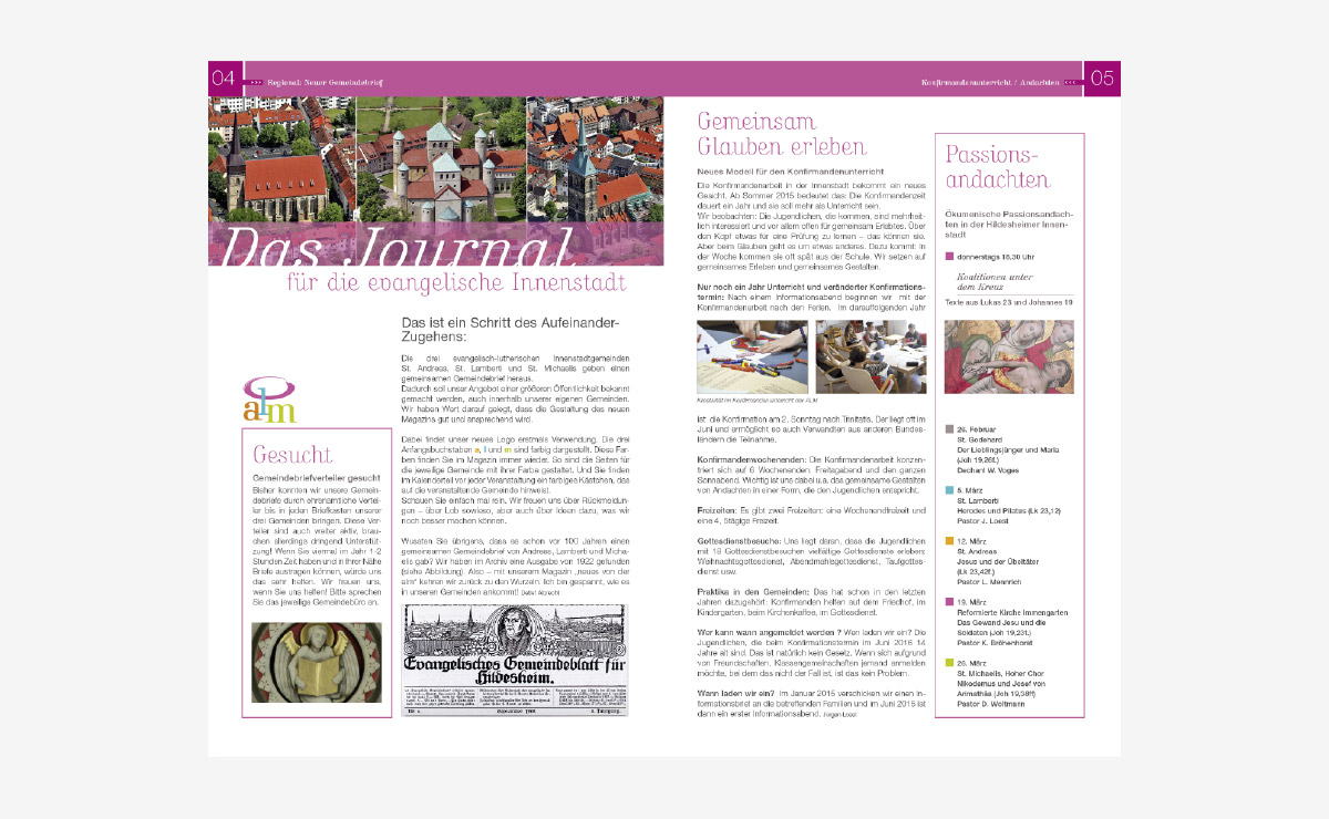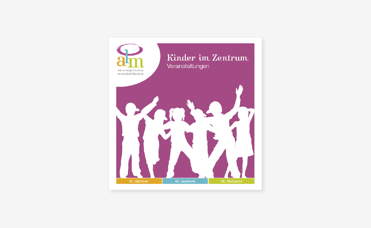 Ein großartiges Projekt für die Hildesheimer Innenstadtkirchen St. Andreas, St. Lamberti und St. Michaelis. Sinn der Aufgabe war, den Menschen einen Überblick über die kirchlichen und spirituellen Angebote zu geben. Innerhalb eines Jahres entstand das neue Logo, Postkarten, Flyer, Plakate und ein 32-seitiges Magazin, was in Zukunft vierteljährlich aufgelegt wird. In Form eines Pixiebuches entwickelten wir für die ALM einen Jahresrückblick der Veranstaltungen für Kinder.