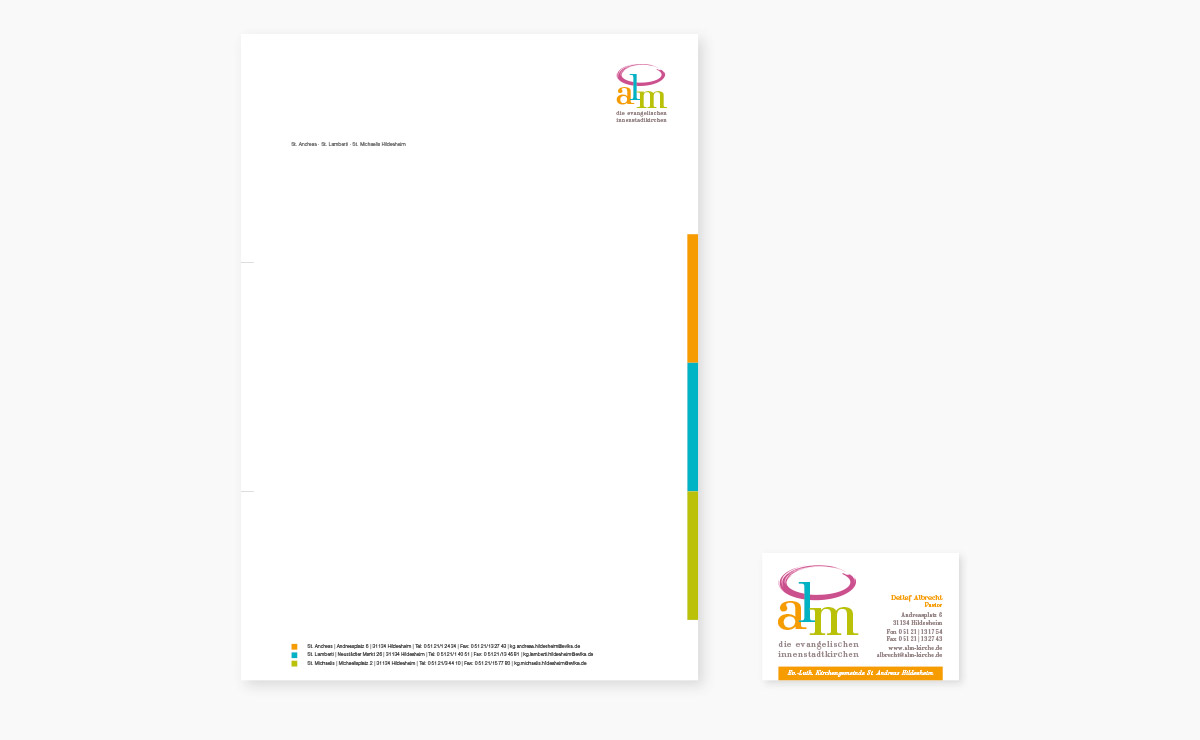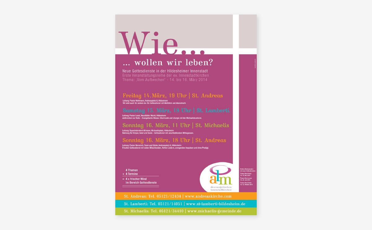 Ein großartiges Projekt für die Hildesheimer Innenstadtkirchen St. Andreas, St. Lamberti und St. Michaelis. Sinn der Aufgabe war, den Menschen einen Überblick über die kirchlichen und spirituellen Angebote zu geben. Innerhalb eines Jahres entstand das neue Logo, Postkarten, Flyer, Plakate und ein 32-seitiges Magazin, was in Zukunft vierteljährlich aufgelegt wird. In Form eines Pixiebuches entwickelten wir für die ALM einen Jahresrückblick der Veranstaltungen für Kinder.