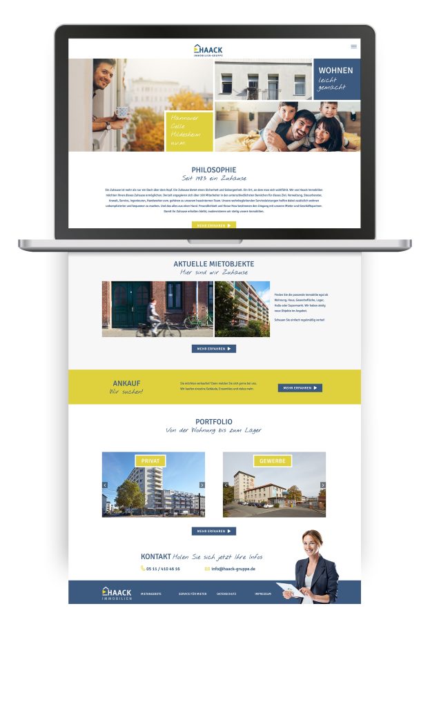 Wir setzen die hauseigene Philosophie ‚Wohnen leicht gemacht‘ im ReDesign WebSeite und Corporate um. Freundlich, zugewandt und sympathisch präsentiert sich nun die Immobilien-Gruppe HAACK. Das Angebot wurde klar strukturiert und vermittelt den Mietern ein sicheres und entspanntes Gefühl.