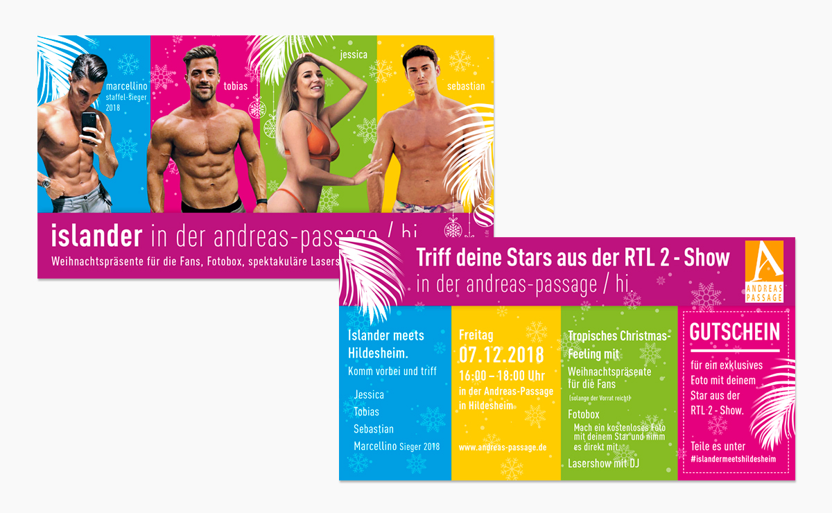 In der Andreas-Passage finden diverse Aktionen statt. Diesmal ein echtes Highlight für die Zielgruppe 12 bis 20 Jahre: Die Stars der RTL2-Show die Islander sind zu Gast. Es gibt Geschenke, kostenlose Fotos mit den Stars, eine Lasershow, DJ, Party und und und.