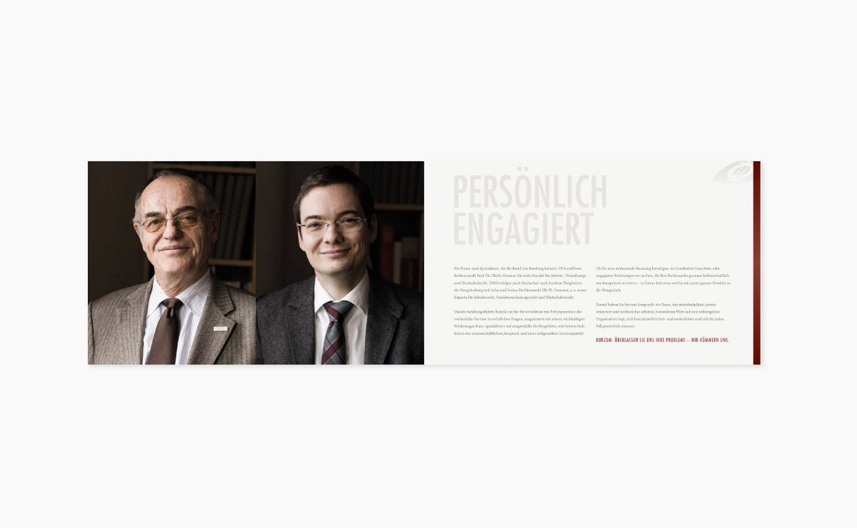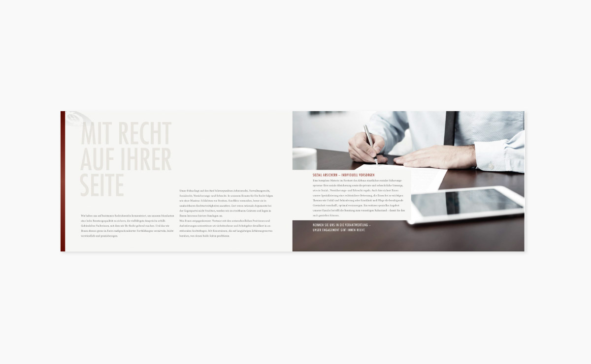 Die Kanzlei bietet mit Sitz in Hildesheim kompetente und umfassende Rechtsberatung für Unternehmen und Privatpersonen an. Wir erstellten für die Rechtsanwälte die Imagebroschüre, die die Freundlichkeit, die Kernkompetenzen und die Beratungsschwerpunkte unterstreicht.