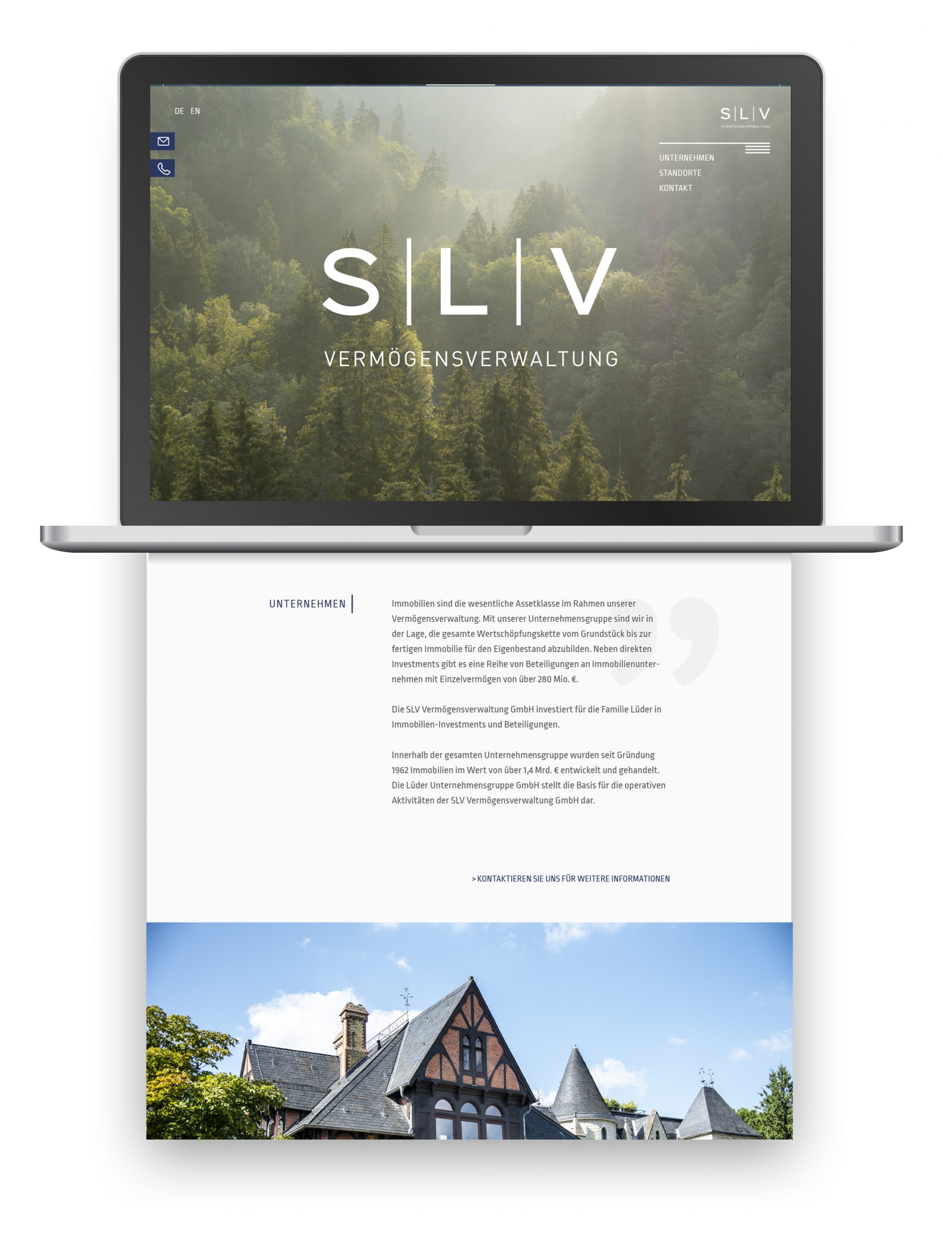 Innerhalb der gesamten Unternehmensgruppe wurden seit der Gründung 1962 Immobilien im Wert von über 1,4 Mrd.€ entwickelt und gehandelt. Die Lüder Unternehmensgruppe GmbH stellt die Basis für die operativen Aktivitäten der SLV Vermögensverwaltung GmbH dar. Das visuelle Bild des Unternehmens wurde von uns in enger Zusammenarbeit mit Julia Hennies entwickelt. Das beeindruckende Lebenswerk von Sebastian Lüder wird dabei zurückhaltend präsentiert.