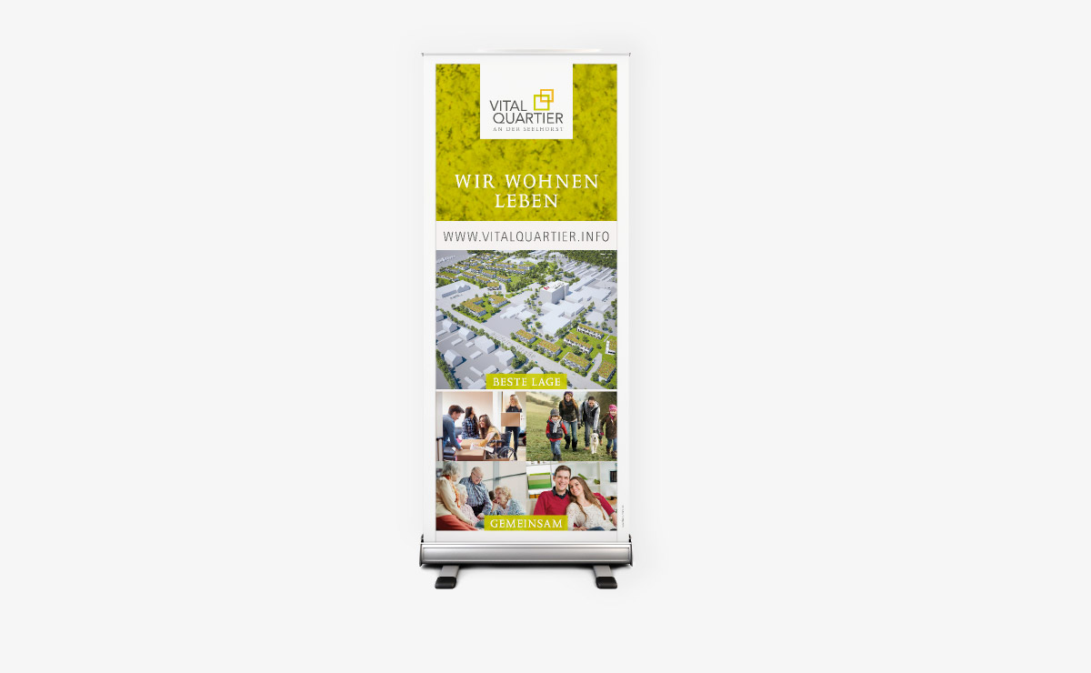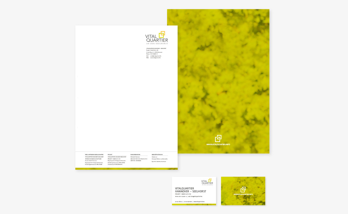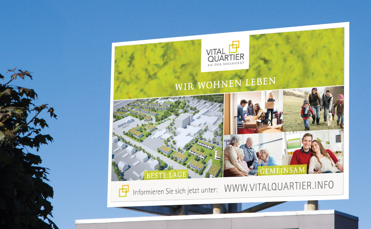 Von der konzeptionellen Ausarbeitung bis zur professionellen Umsetzung des Corporate Identity/Design begleiten wir das Vitalquartier in allen medialen Phasen von Print bis Web, von der Geschäftsausstattung bis zur Werbekampagne, von Bauzaun bis zur Webbeschreibung.Unsere Aufgaben: