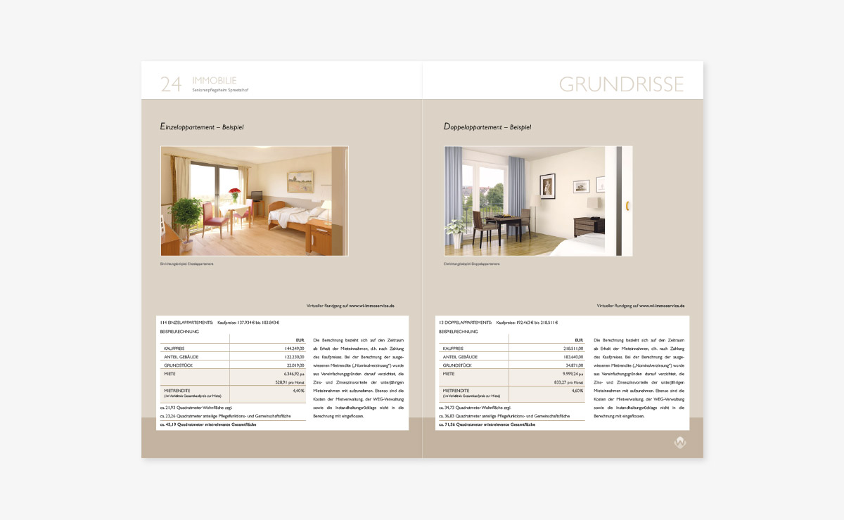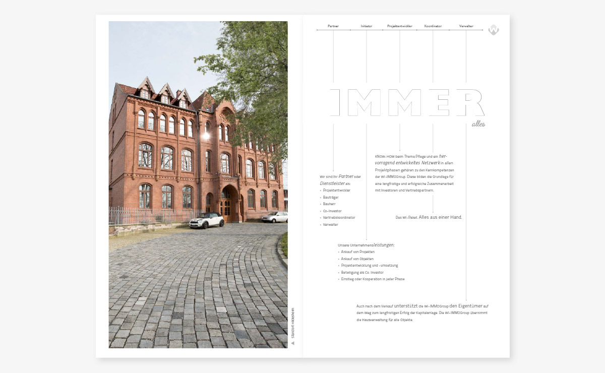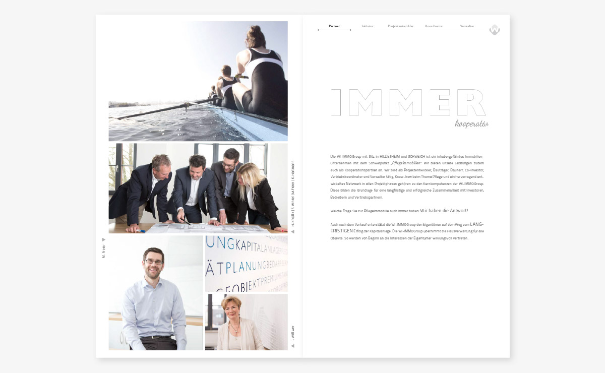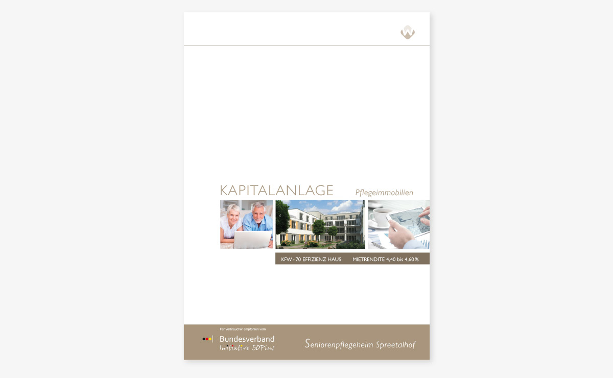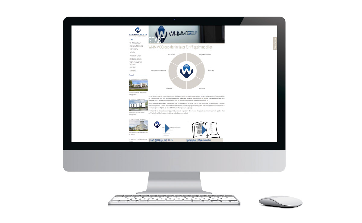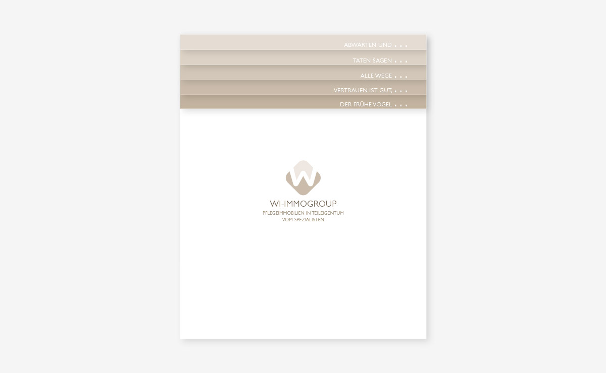 WI-Immogroup vermarktet Pflegeimmobilien in Teileigentum. Wir entwickelten die neue Firmenpräsentation – medienübergreifend. Dazu zählen Produktblätter, Projektbroschüren, Imagepräsentationen, PPT, Internet-Präsentationen und ein Imagefilm. Der visuelle Eindruck ist dabei immer aufgeräumt, seriös und spannend.Kundenbeschreibung: