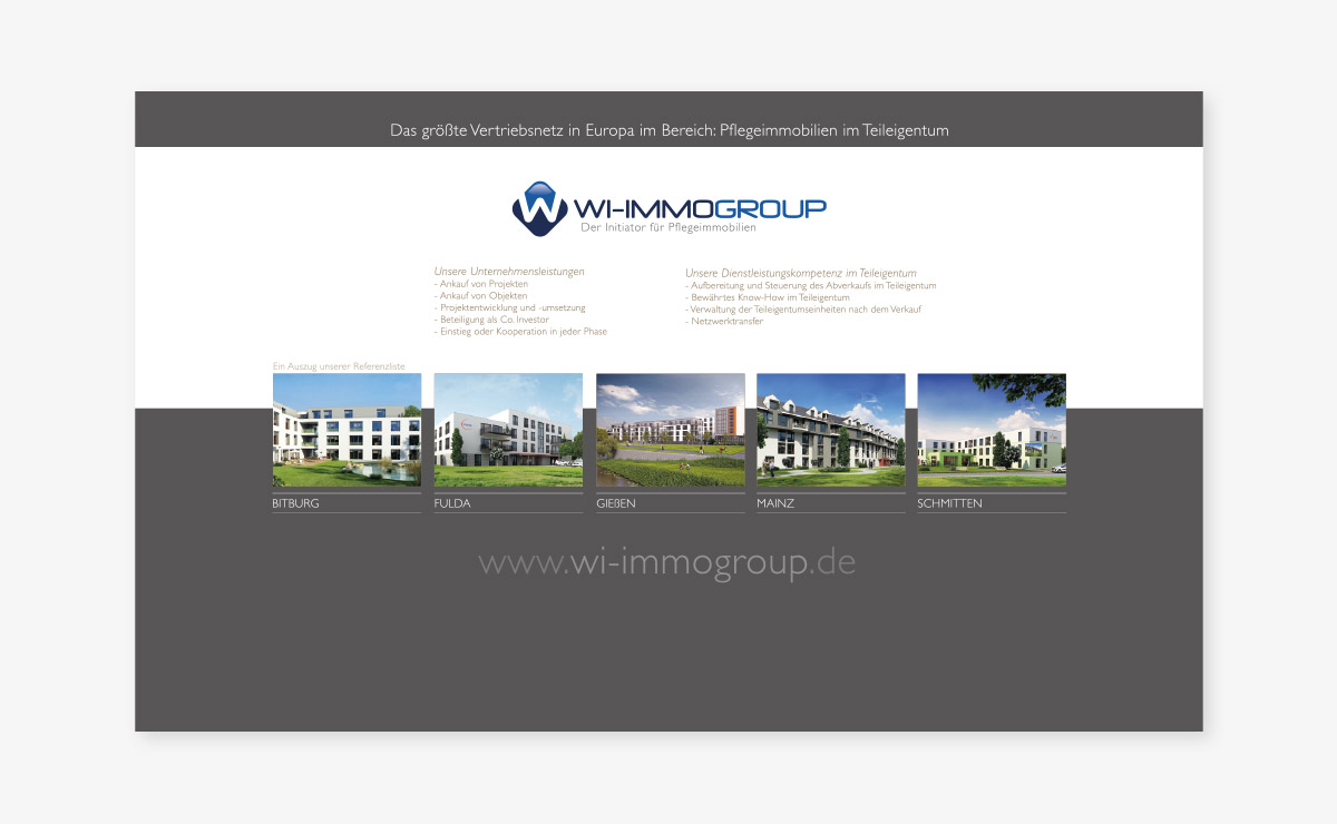 WI-Immogroup vermarktet Pflegeimmobilien in Teileigentum. Wir entwickelten die neue Firmenpräsentation – medienübergreifend. Dazu zählen Produktblätter, Projektbroschüren, Imagepräsentationen, PPT, Internet-Präsentationen und ein Imagefilm. Der visuelle Eindruck ist dabei immer aufgeräumt, seriös und spannend.Kundenbeschreibung: